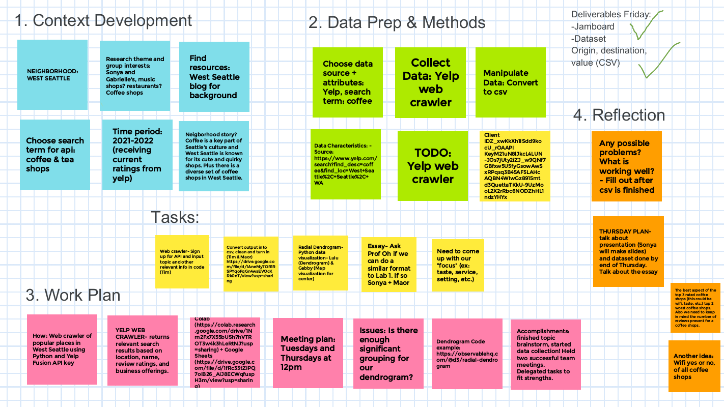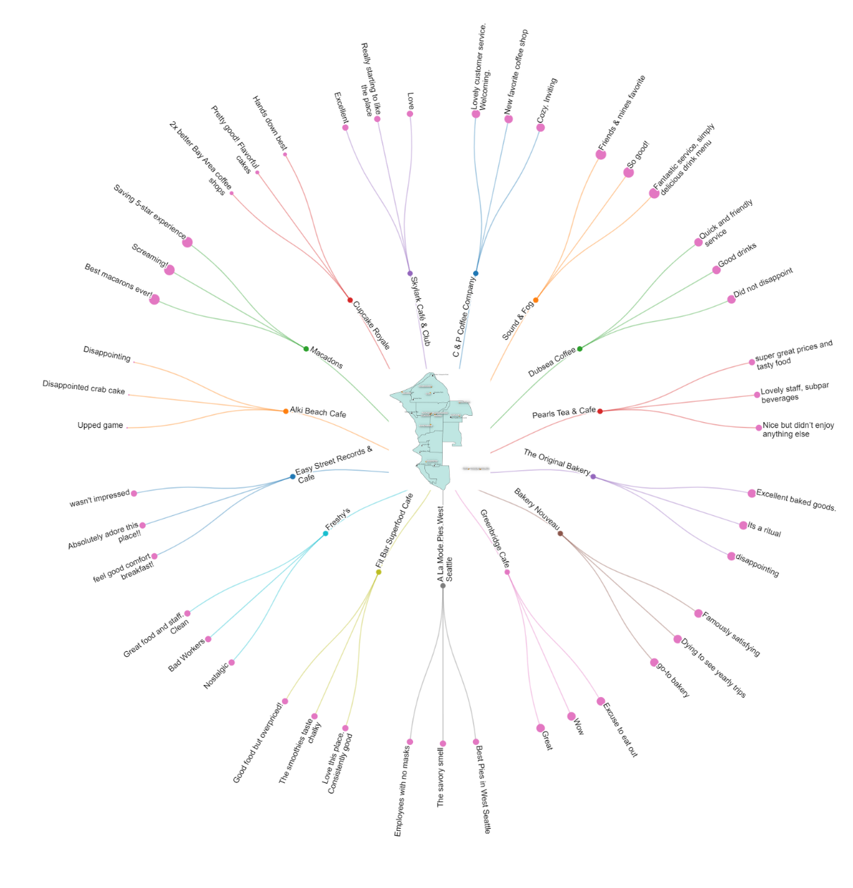 As a team, we met to discuss how we would tackle this large project. Our TA wrote the Yelp API script and we needed to edit it to pull West Seattle coffee shop data versus all Seattle business data. After we had a dataset, we needed to clean it to get rid of long reviews and drop businesses that were not in West Seattle (but classified as it). Once we had a workable dataset, one of my teammates and I wrote the code to create the radial dendrogram with reviews and logical nodes. I also created a map in QGIS of West Seattle and the resulting coffee shops.